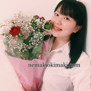 ↑Září 2021, na moje narozeniny, s kyticí, kterou jsem dostala. Ještě jsou vidět mezery mezi zuby, ale už se začínají znatelně rovnat.